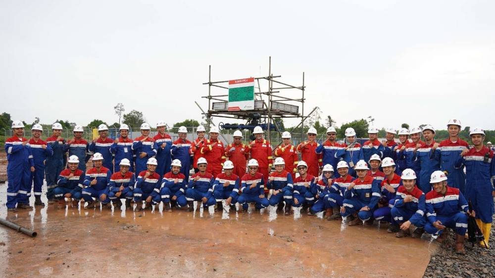 Tim Pertamina Hulu Energi (PHE) Jambi Merang berfoto bersama di kawasan Sumur eksplorasi, Sumetra Selatan. (Foto: Pertamina)
